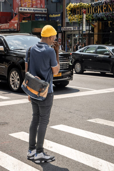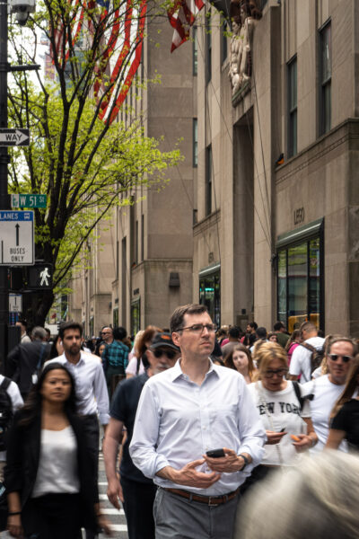 Während meine Freundin die Zeit nutzte, um sich in verschiedenen Läden umzusehen, blieb ich meistens draußen vor den Geschäften stehen und versuchte mit meiner Kamera, ein paar Straßenszenen einzufangen. Mein Fokus lag an diesem Tag darauf, das urbane Durcheinander, die Bewegung, den Rhythmus der Stadt festzuhalten. Ich wollte ein Foto schießen, auf dem klar wird: Viele Menschen sind in Bewegung, während ein einzelner Mensch oder Gegenstand stillsteht – der Kontrast von Hektik und Ruhe inmitten von New York. Genau das wollte ich mit einem Bild ausdrücken.