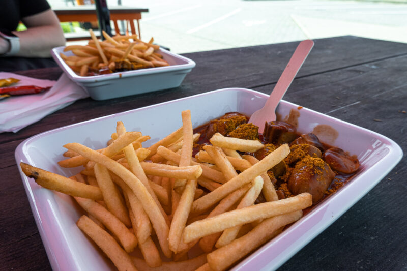 Die Autofahrt verlief so unspektakulär wie unser letzter Flug unseres Reiseabenteuers. Das letzte kulinarische Highlight der Weltreise war eine nicht ganz so gesunde Currywurst mit Pommes. Nicht gesund, aber durchaus lecker.