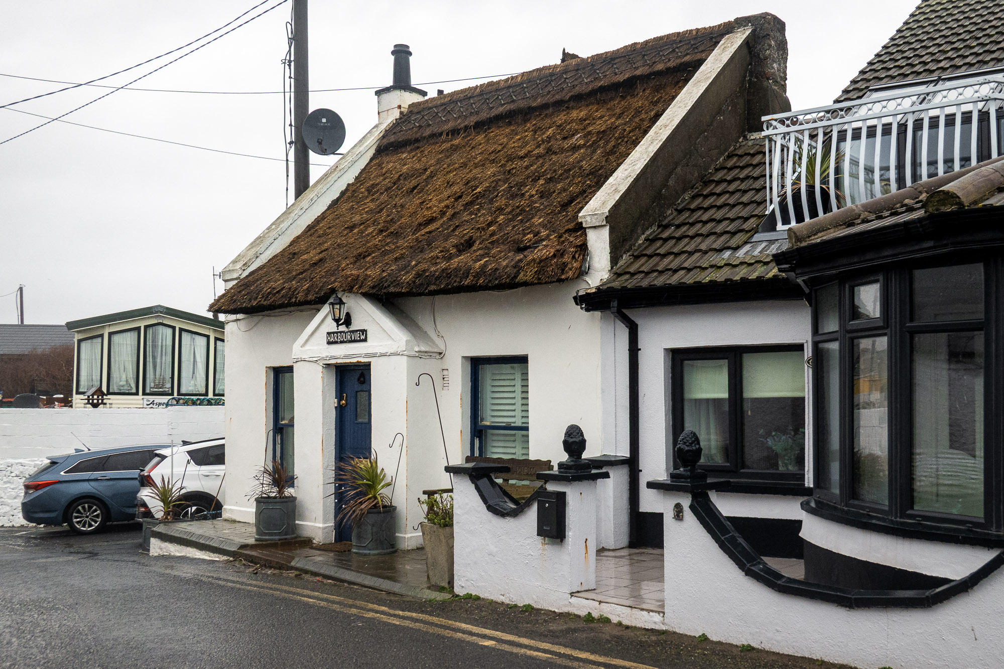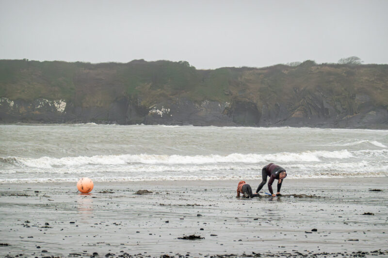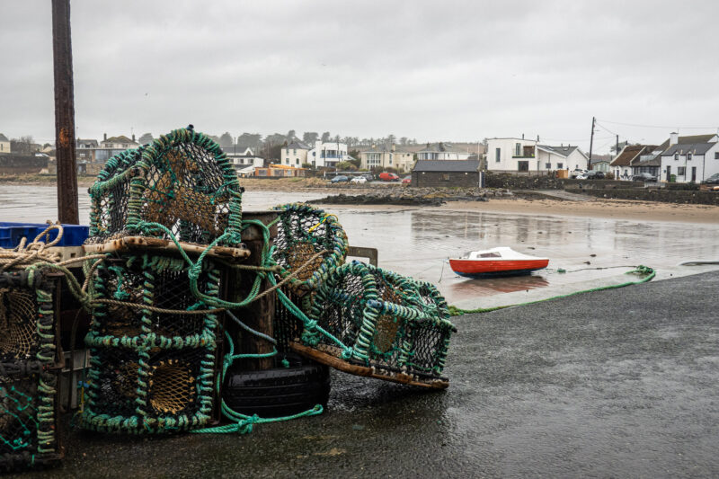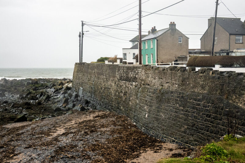 Nur wenige Kilometer nördlich von Rush liegt der Loughshinny Harbour. Als wir dort ankamen und unseren Mietwagen abstellten, überraschte uns erneut ein Anblick der anscheinend regenresistenten Iren: Ein Vater spielte trotz Sturm und Regen mit seinem Kind am Strand. Die beiden bauten fröhlich Sandburgen oder suchten etwas im Sand – wie auch immer, sie hatten eindeutig den Spaß ihres Lebens. Natürlich waren sie bestens ausgestattet: Beide trugen Neoprenanzüge und darüber noch eine Jacke.