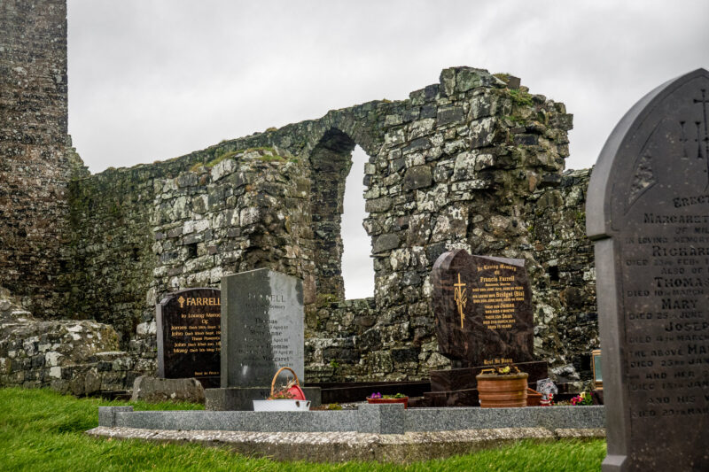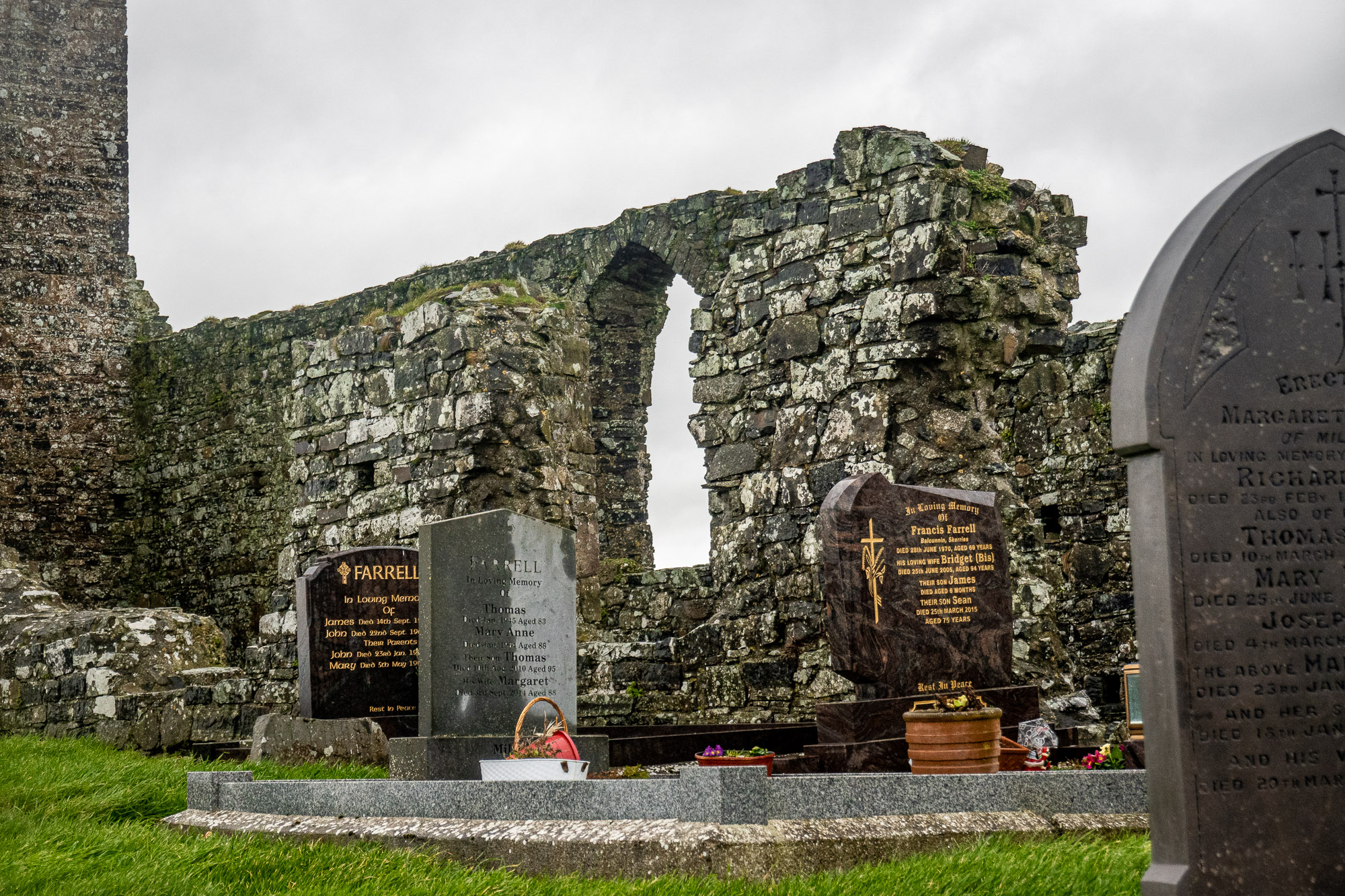 Ein kleines Highlight hatte ich mir für den Rückweg noch ausgesucht: eine verfallene Kirche mit angrenzendem Friedhof. Was ich dabei allerdings nicht bedacht hatte, war, wie schlammig und durchnässt die Wiesenwege sein würden. So bestand durchaus die Gefahr, dass wir am Ende die Passagiere mit den nassesten und schmutzigsten Schuhen im Flugzeug sein würden. Aber gut – dieses Risiko gingen wir ein. Rückblickend kann ich sagen: Die große Katastrophe blieb aus.