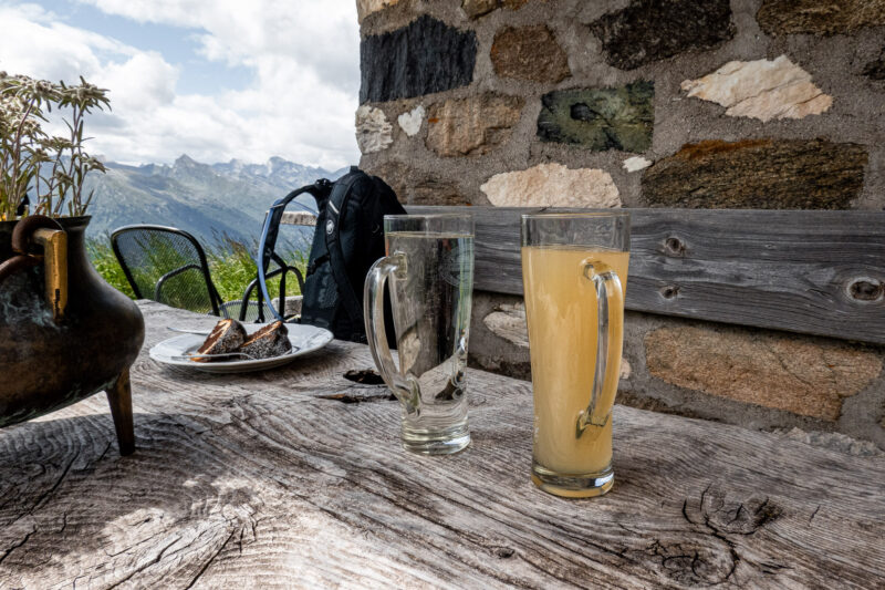 In der Hütte angekommen, traf ich wieder auf meine Freundin und belohnte mich mit meiner Apfelschorle. Der halbe Liter dieses köstlichen Getränks war in wenigen Schlucken ausgetrunken. Wir blieben noch eine ganze Weile sitzen, genossen die wunderschöne Aussicht und betrachteten die Gipfel aus nächster Nähe mit meinem neuen Fernglas.