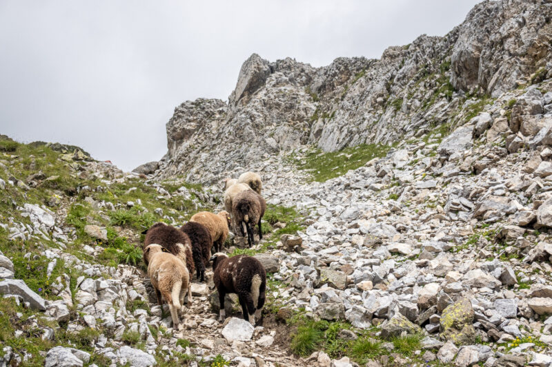 Nachdem ich mich ins Gipfelbuch eingetragen hatte, begann ich den Abstieg. Schon beim Aufstieg hatte ich eine kurze Passage mit leichter Kletterei zu überwinden. Diese Stelle meisterte ich nun mit voller Konzentration auch bergab, bevor ich wieder in einen lockeren Schritt überging. Vorbei an den zahlreichen Schafen, die mich schon beim Aufstieg gesehen hatten und nun deutlich entspannter reagierten als noch vor zwanzig Minuten.