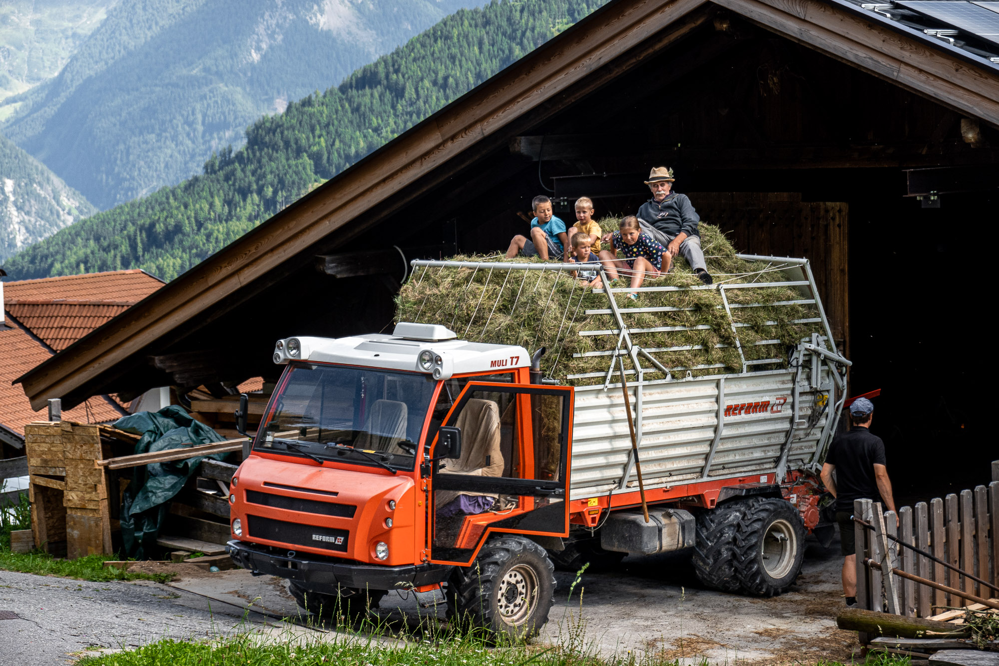 Frisch gestärkt machten wir uns an den Abstieg. Er war landschaftlich weniger spannend, aber dennoch angenehm. Gegen Ende der Tour begegneten wir noch einem Bauern, der zusammen mit seiner Familie die Wiesenernte in seine Scheune einfuhr.