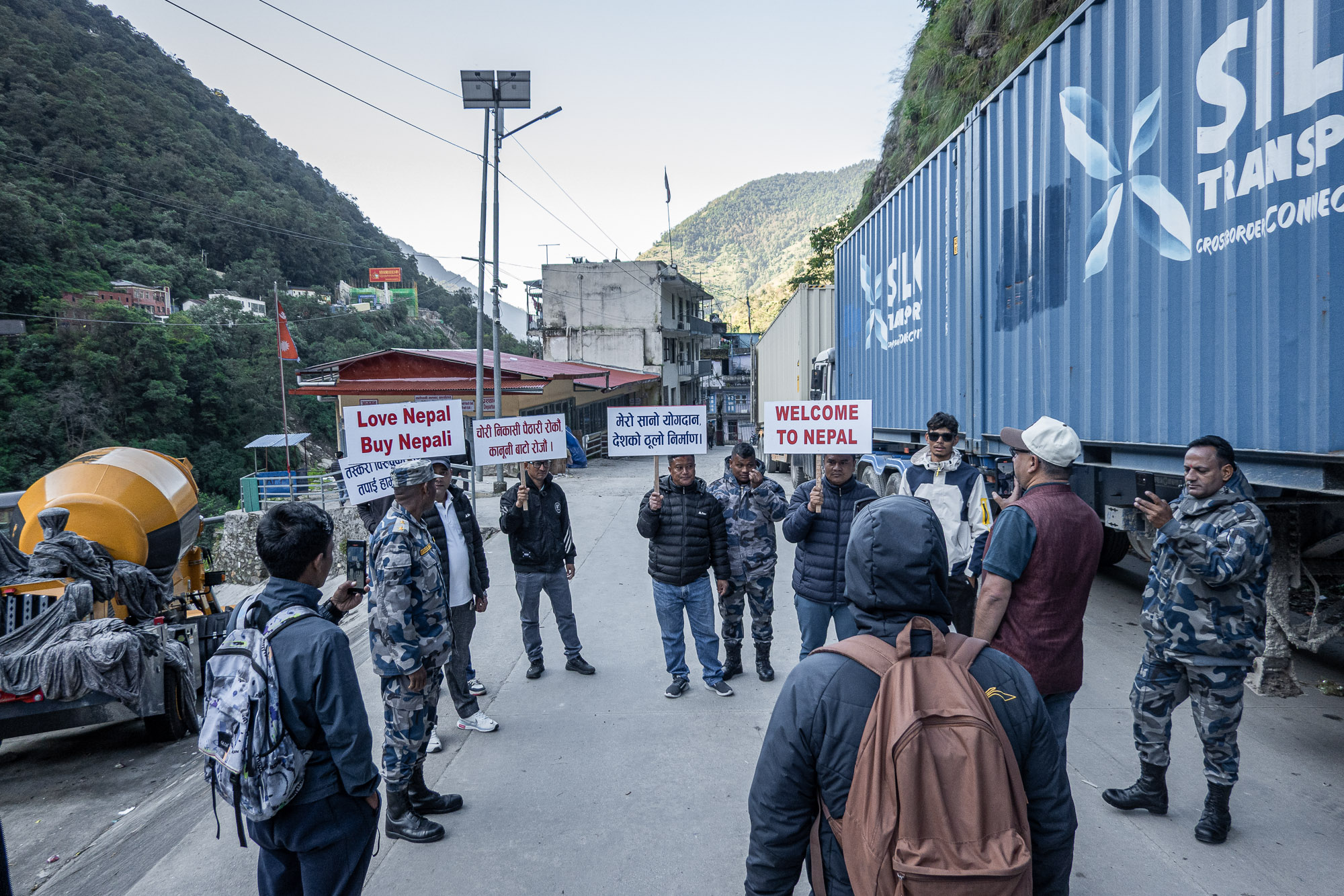 Wir wurden von unserem Guide Tenzi von „Explore Tibet“ bis zur letzten Grenzformalität an der Grenze unterstützt. Auf nepalesischer Seite wartete schon gut sichtbar für uns der Kontaktmann, der uns bei unserem Grenzübertritt nach Nepal half.