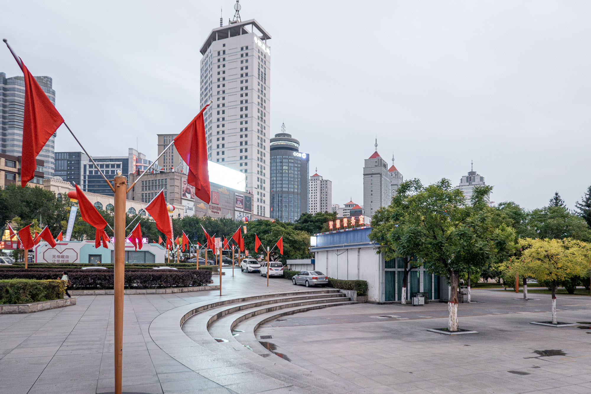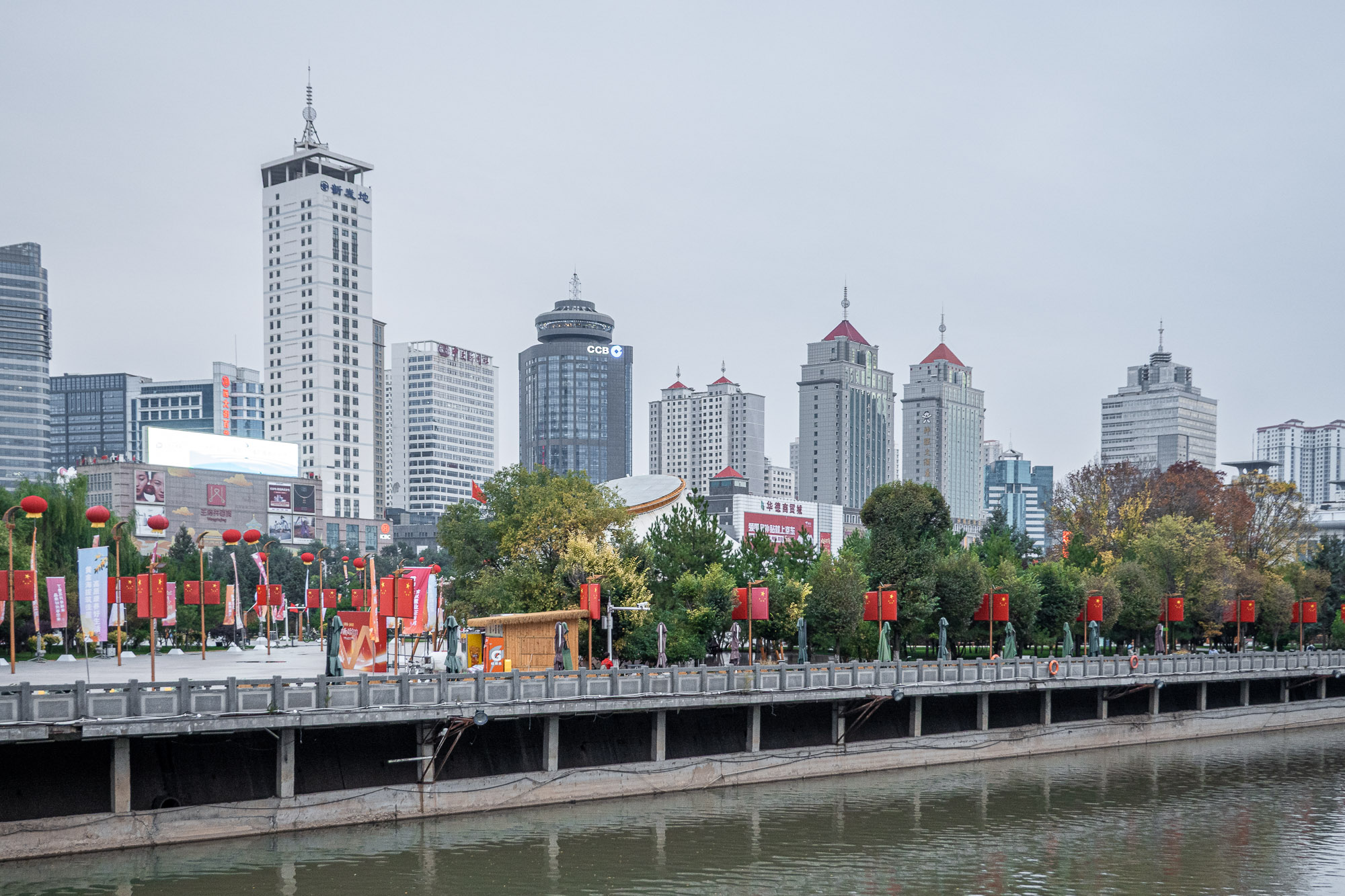 Der letzte Sightseeing-Stop des Tages sollte der Central Square von Xining sein. Wir nahmen uns ein Taxi, um schnell von der Fußgängerzone zum Hauptplatz der Stadt zu gelangen, der direkt am Nanchuan River gelegen ist. Am Platz angekommen, wurden wir von zahlreichen chinesischen Flaggen begrüßt. Man hat hier jedoch nicht nur eine schöne Sicht auf die Staatsflaggen, sondern auch auf die kleine Skyline von Xining. Ich muss sagen, dieser Anblick hat mir sehr gefallen.