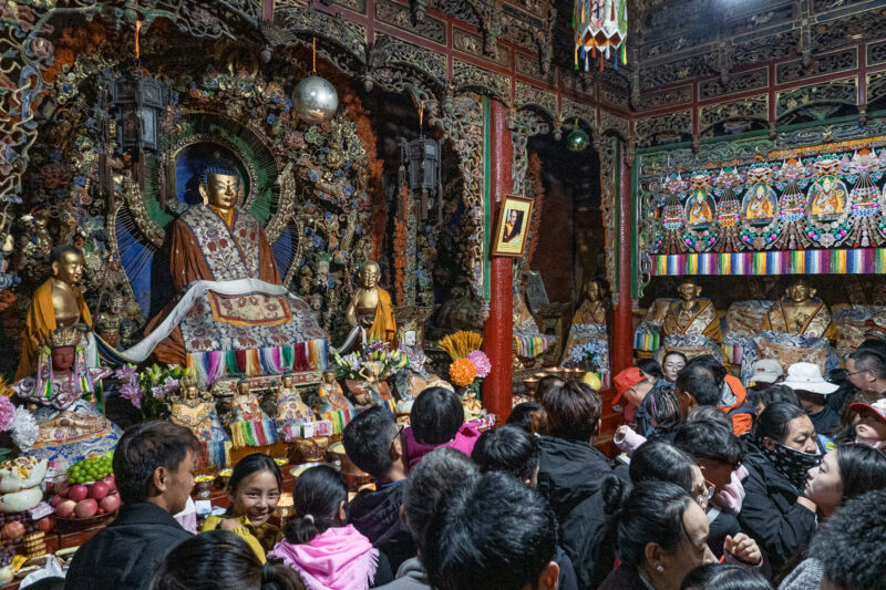 Für mich war dies der erste direkte Kontakt mit der tibetischen Kultur – und ich war begeistert. Wir hielten uns lange in dem Kloster auf und hätten problemlos noch mehr Zeit auf dem Gelände verbringen können. Hier lernte ich allerdings auch, dass man in dieser Kultur keine Pluspunkte sammelt, wenn man in bedeutenden Tempeln fotografiert. Ein einheimischer Fotograf gab mir am Eingang eines Tempels einen entsprechenden Hinweis. Leider verstand ich erst im Nachhinein, als ich bereits ermahnt wurde, was er mir hatte sagen wollen. Wie auch immer: Es war keine Absicht, und dennoch entstand durch mein frevelhaftes Verhalten eine starke Aufnahme aus dem Inneren des Tempels.